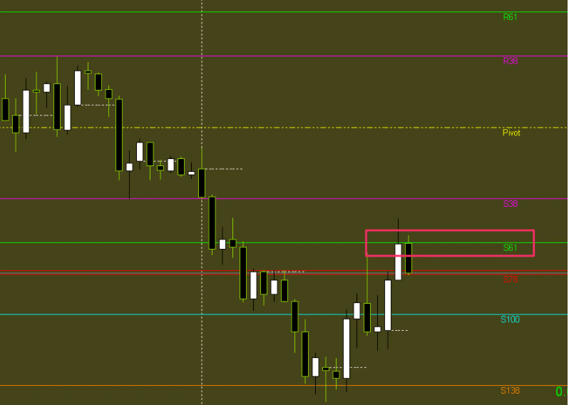 Normalmente las zonas entre el 61-100 son zonas importantes y puedes comerciar en reversión o continuidad de la tendencia. Funciona en ambos sentidos, y los pivotes semanales son el "equilibrio" creado por debajo en venta o por encima en compras.