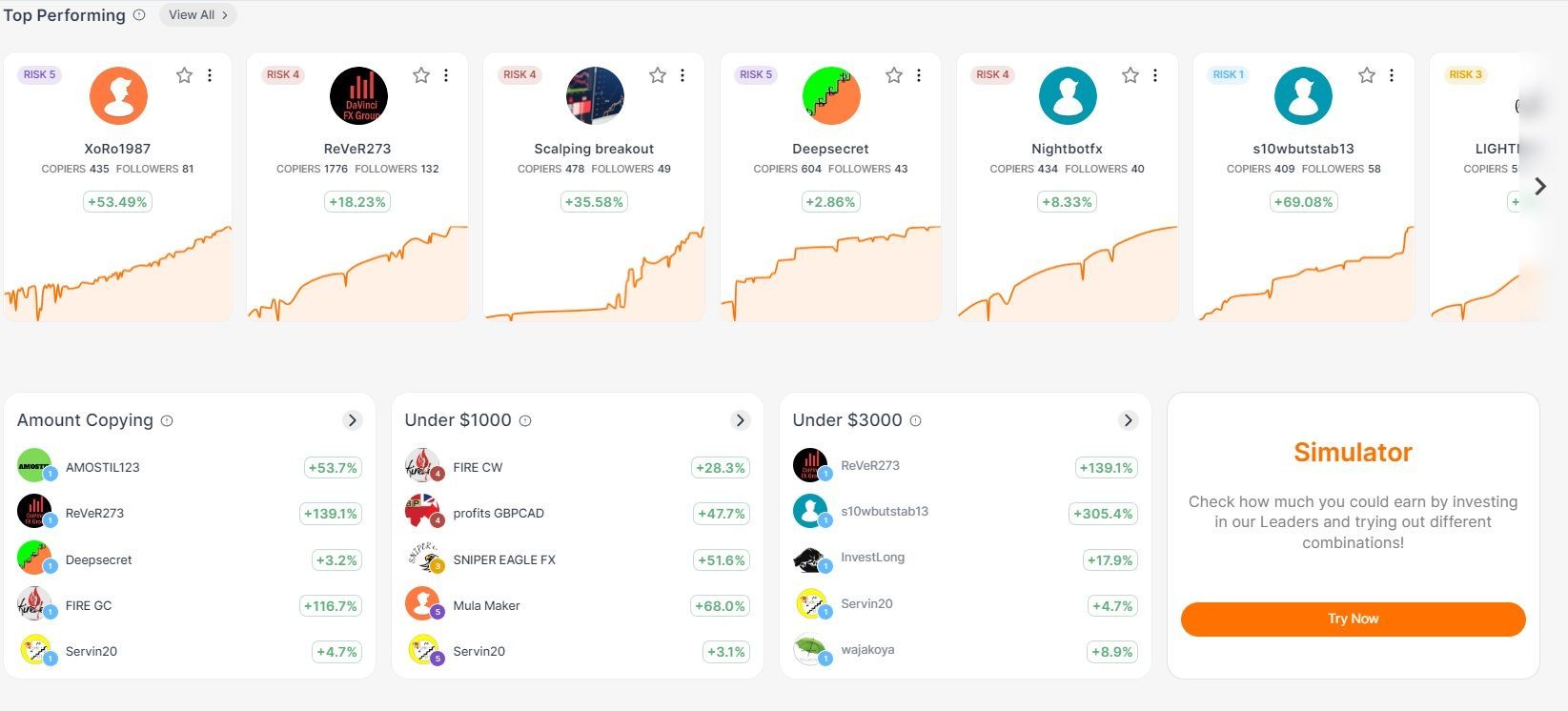 Además de poder seleccionar uno o más traders con los criterios o habilidades que buscar para invertir, puedes usar la herramienta del simulador. Con esta herramienta, podrás simular los beneficios y ganancias que te va a generar ese traders dependiendo del capital y el tiempo de inversión. Te recomendamos siempre usar el capital mínimo que recomienda el trader para llevar a cabo su operativa.