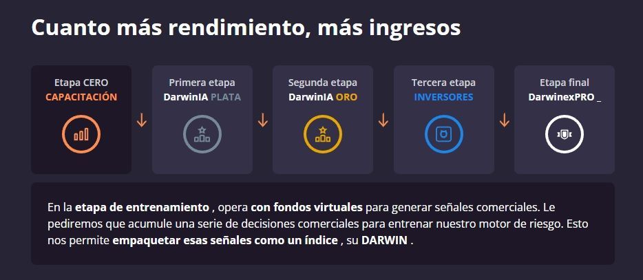 DarwinexZero consta de 5 etapas en dónde aprenderás paso a paso cómo construir tú Darwin, obtener premios DarwinIA y cómo llegar a obtener inversores reales en tú Darwin.