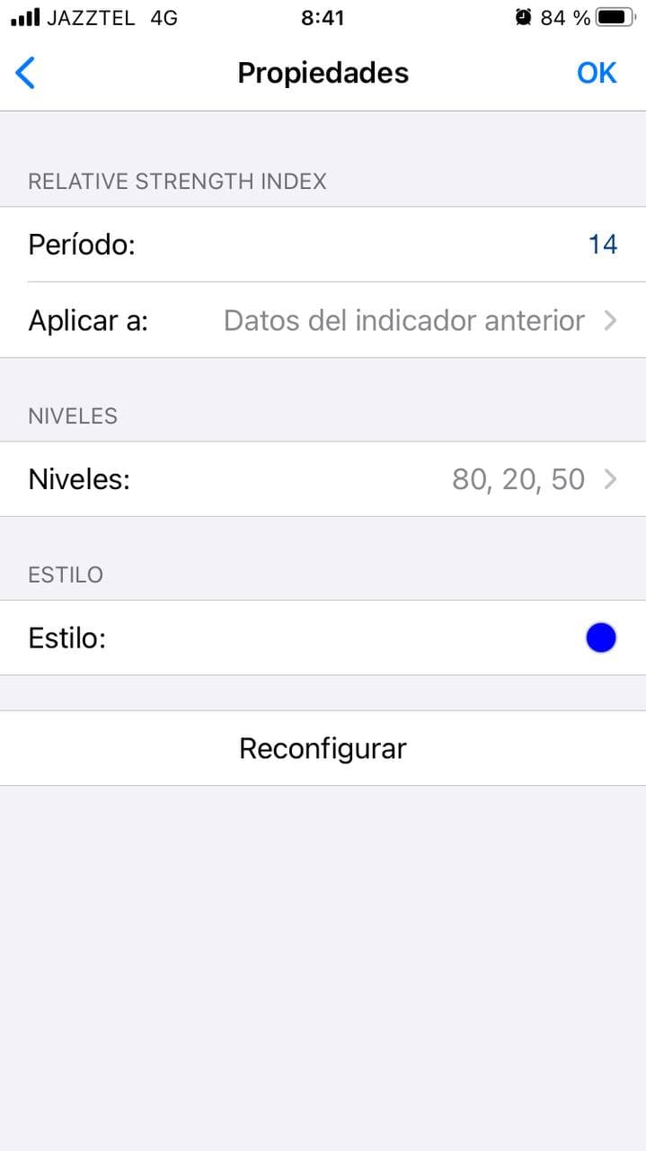 - Sobre esa misma media, añade un RSI de 14 periodos, aplicando a los datos del indicador anterior.