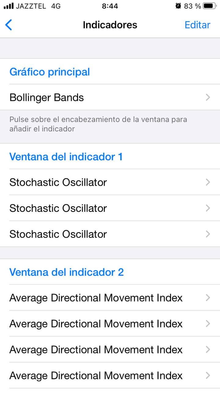 Para usar correctamente la estrategia desde la app MT4, debes añadir y configurar los siguientes indicadores en las ventanas de indicadores de la app: