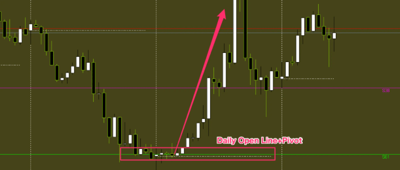 La línea de apertura diaria también actúa como soporte / resistencia como un pivot point. La estrategia se fortalece si se superponen Línea abierta diaria + Punto pivote.