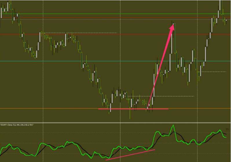 El límite del movimiento del precio cercano a un punto pivote o una divergencia en el TDI son factores de entrada dependiendo de la tendencia.