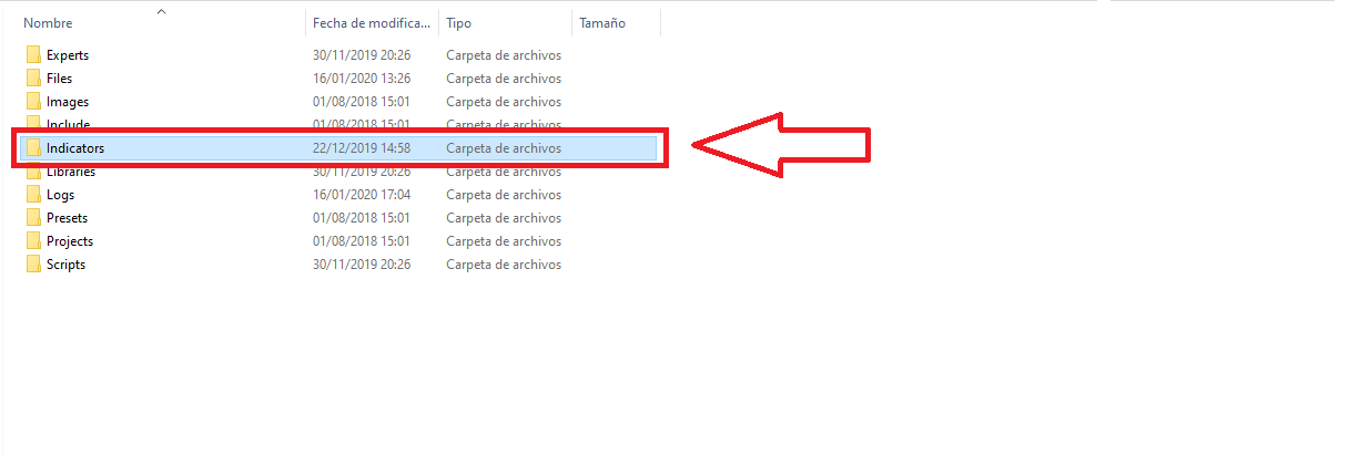 Paso 2: Abre la carpeta de MQL4 / Indicators, una vez allí, arrastra el archivo de descarga del indicador como se ve en la imagen.